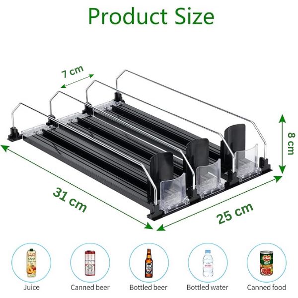 📦 Oszczędza miejsce w lodówce, utrzymując puszki i butelki w uporządkowanej formie