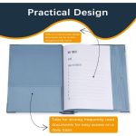 Ręcznie ilustrowany spis treści i etykiety samoprzylepne ułatwiają śledzenie dokumentów w sposób prosty i stylowy.